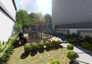 The building comprises 114 apartments with 2 room, 3 room and 4 room units, each carefully designed to ensure the separation of spaces with special attention given to privacy and offer a homely feeling. Each apartment has a mini backyard with access from the kitchen. The kitchens are designed as enclosed spaces separated by masonry and glass partitions.